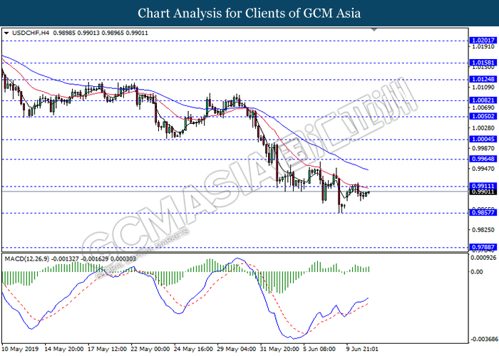 USDCHF, H4: USDCHF was traded higher while currently testing near the resistance level 0.9910. MACD which illustrate bullish bias signal suggest the pair to extend its gains after it breaks above the resistance level.
