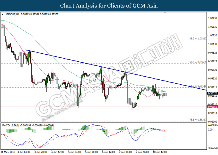 USDCHF, H1: USDCHF remains traded within a descending triangle formation. MACD which illustrate diminishing downward momentum suggests the pair to be traded higher in short-term as technical correction.