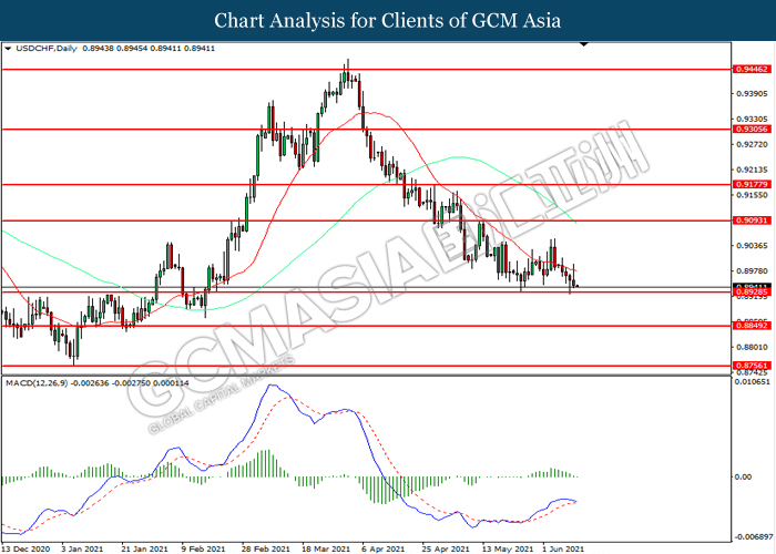 USDCHF, Daily: USDCHF was traded lower while currently testing the support level at 0.8930. MACD which illustrated diminishing bullish momentum suggest the pair to extend its losses after it successfully breakout below the support level.