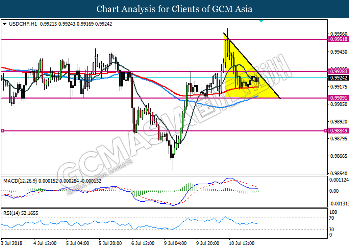 USDCHF, H1: USDCHF was traded lower in a descending triangle following prior retracement from the top of the triangle and resistance level 0.9930.Although MACD and RSI which display ongoing downward momentum and a bearish crossover, a break below the bottom of triangle which is the support level of 0.9900 is needed to attain confirmation.