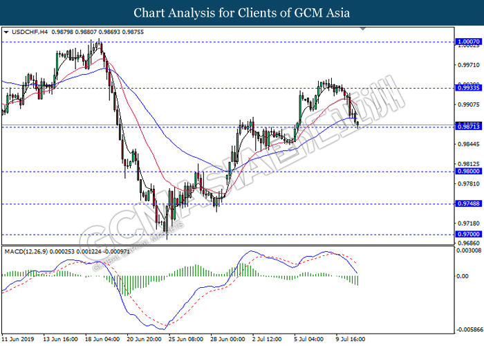 USDCHF, H4: USDCHF was traded lower while currently testing the support level 0.9870. MACD which illustrate bearish momentum signal suggest the pair to extend its losses after it breaks below the support level.