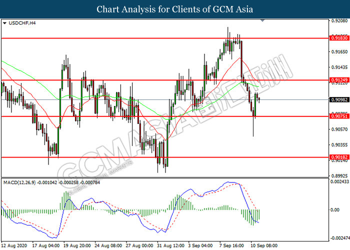 USDCHF, H4: USDCHF was traded higher following prior rebound from the support level at 0.9075. MACD which illustrated diminishing bearish momentum suggest the pair to extend its gains toward resistance level at 0.9125.