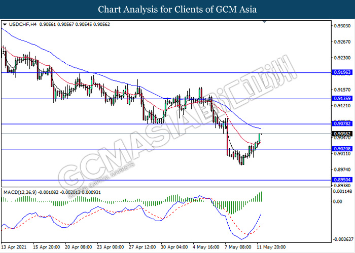 USDCHF, H4: USDCHF was traded higher following prior breakout above the previous resistance level 0.9020. MACD which illustrate persistent bullish bias signal suggest the pair to extend its gains towards the resistance level 0.9080.