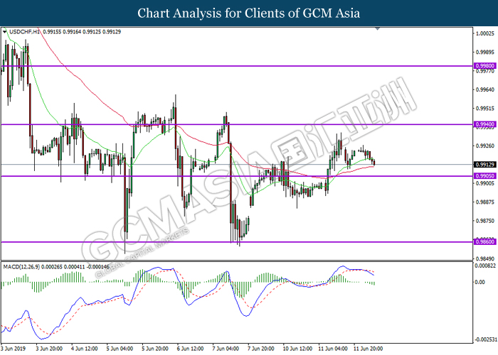 USDCHF, H1: USDCHF was traded lower while currently testing near the support level at 0.9905. MACD which illustrate bearish momentum and the formation of death cross suggest the pair to extend its losses after successfully breaking below the support level.