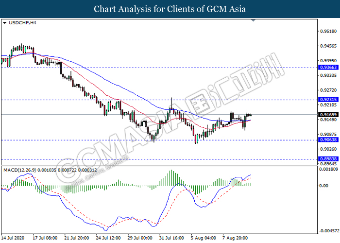 USDCHF, H4: USDCHF was traded higher following recent rebound from its low level. MACD which illustrate bullish momentum suggest the pair to extend its rebound towards the resistance level 0.9230.