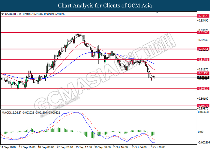 USDCHF, H4: USDCHF was traded lower following prior breakout below the previous support level at 0.9180. However, MACD which display diminishing bearish momentum signal suggest the pair to undergo technical correction toward a higher level.