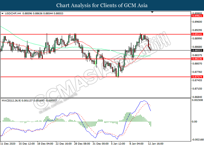 USDCHF, H4: USDCHF was traded lower following prior retracement from the resistance level at 0.8915. MACD which illustrated increasing bearish momentum suggest the pair to extend its losses toward support level at 0.8825.