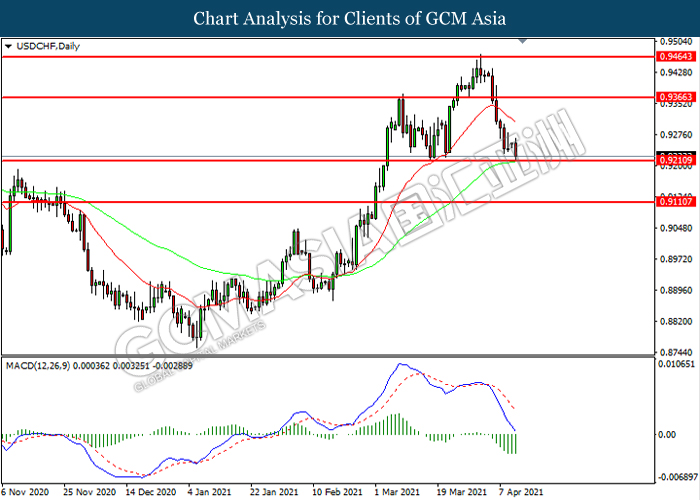 USDCHF, Daily: USDCHF was traded lower while currently testing the support level at 0.9210. MACD which illustrated increasing bearish momentum suggest the pair to extend its losses after it successfully breakout below the support level.