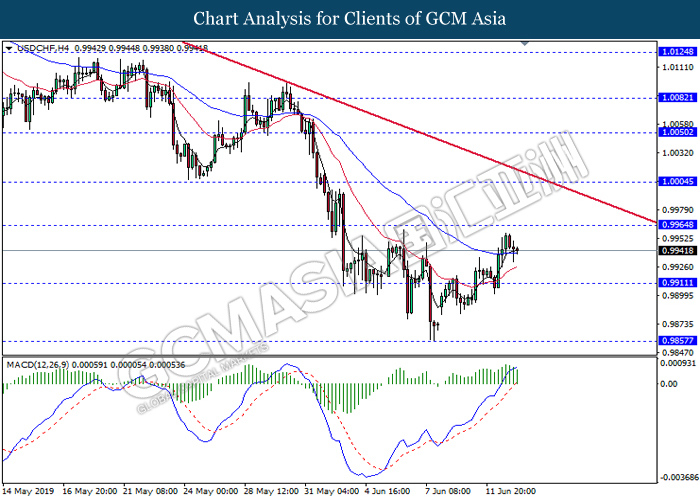 USDCHF, H4: USDCHF was traded lower following prior retracement from the resistance level 0.9965. MACD which illustrate bearish bias signal suggest the pair to extend its retracement towards the support level 0.9910.