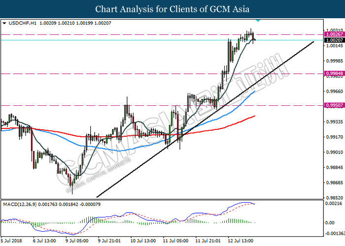 USDCHF, H1: USDCHF was traded lower following prior retracement from the resistance level 1.0030. MACD which illustrate a diminished bullish bias with the formation of death cross suggest the pair could be traded lower as a short term technical correction towards support level 0.9980