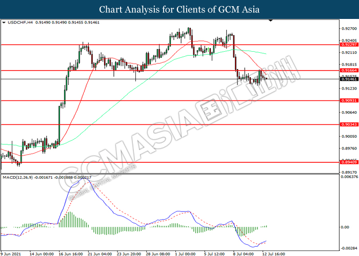 USDCHF, H4: USDCHF was traded lower following prior breakout below the previous support level at 0.9165. However, MACD which illustrated increasing bullish momentum suggest the pair to be traded higher in short-term as technical correction.