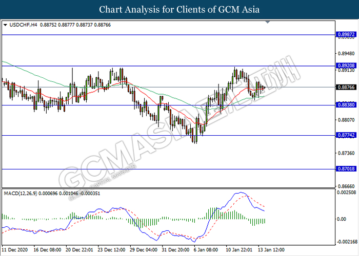 USDCHF, H4: USDCHF was traded higher following recent rebound from the support level 0.8840. MACD which illustrate diminishing bearish momentum signal suggest the pair to extend its rebound towards the resistance level 0.8920.