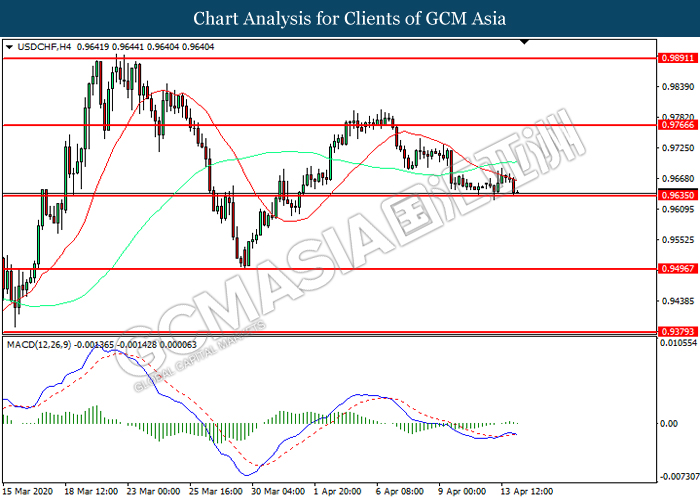 USDCHF, H4: USDCHF was traded lower while currently testing the support level at 0.9635. MACD which illustrated diminishing bullish momentum suggest the pair to extend its losses after it successfully breakout below the support level.