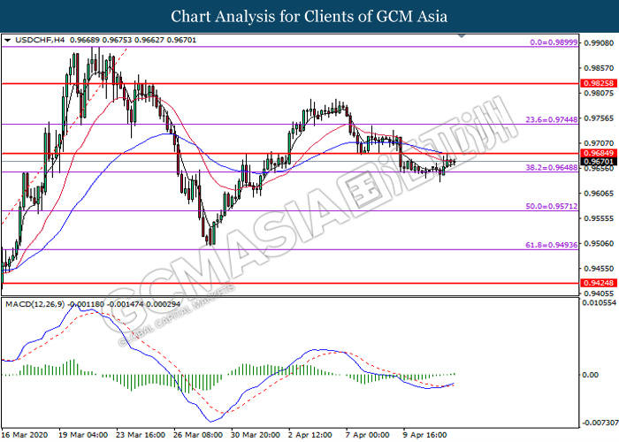 USDCHF, H4: USDCHF was traded higher following prior rebound from the support level at 0.9650. MACD which illustrate bullish momentum signal suggest the pair to extend its gains toward the resistance level at 0.9685.