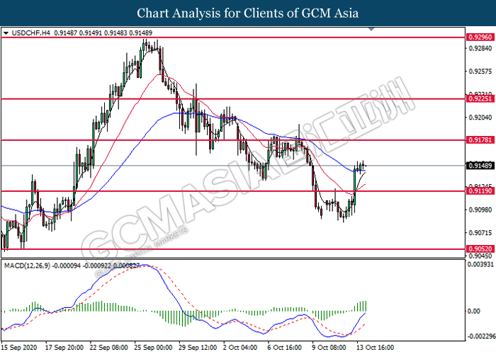 USDCHF, H4: USDCHF was traded higher following prior breakout above the previous resistance level at 0.9120. MACD which display bullish bias momentum signal suggest the pair to extend its gains toward the resistance level at 0.9180.