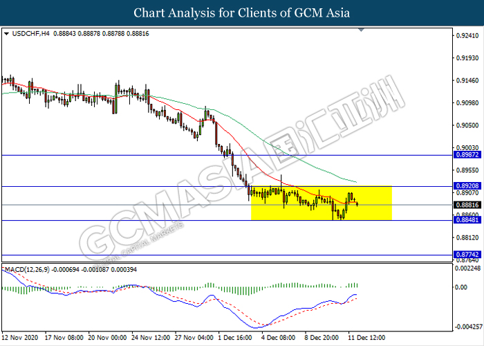 USDCHF, H4: USDCHF remain traded in a sideway channel. However, MACD which illustrate bearish bias signal suggest the pair to be traded lower in short term towards the support level 0.8850.
