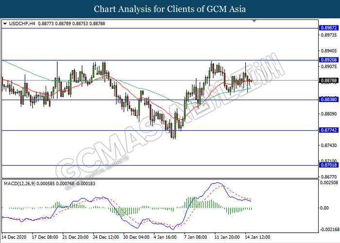 USDCHF, H4: USDCHF was traded lower following prior retracement from the resistance level 0.8920. MACD which illustrate ongoing bearish momentum signal suggest the pair to extend its retracement in short term towards the support level 0.8840