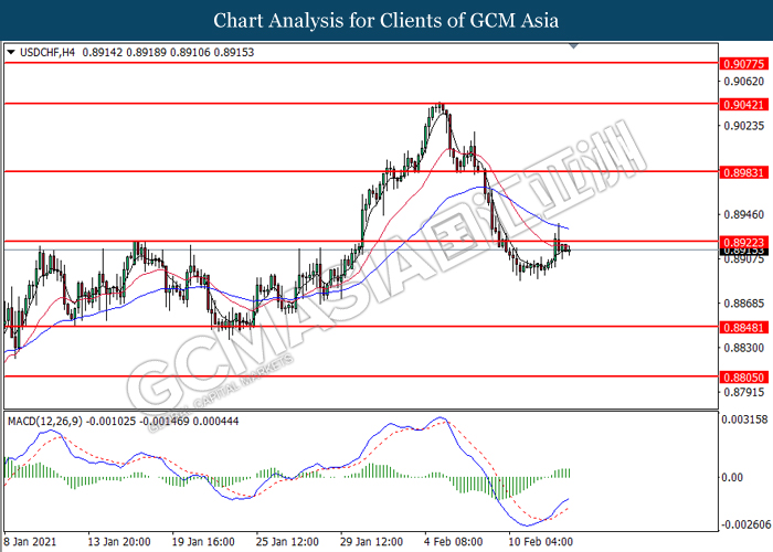 USDCHF, H4: USDCHF was traded higher while currently testing the resistance level at 0.8920. MACD which illustrated bullish bias momentum suggest the pair to extend its gains after it successfully breakout above the resistance level.