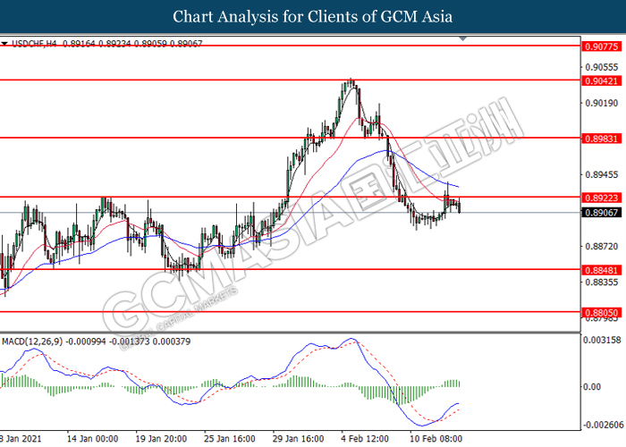USDCHF, H4: USDCHF was traded higher while currently testing the resistance level at 0.8920. However, MACD which illustrated diminishing bullish momentum suggest the pair to undergo technical correction in short term.