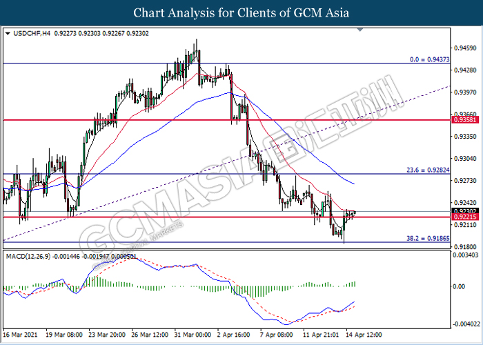 USDCHF, Daily: USDCHF was traded lower higher following prior breakout above the resistance level at 0.9220. MACD which illustrated bullish bias momentum suggests the pair to extend its gains toward the resistance level at 0.9280.