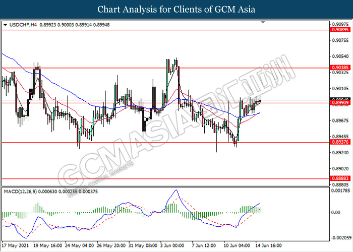 USDCHF, H4: USDCHF was traded higher following prior breakout above the previous resistance level 0.8990. MACD which illustrate bullish momentum signal suggest the pair to extend its gains towards the resistance level 0.9040.