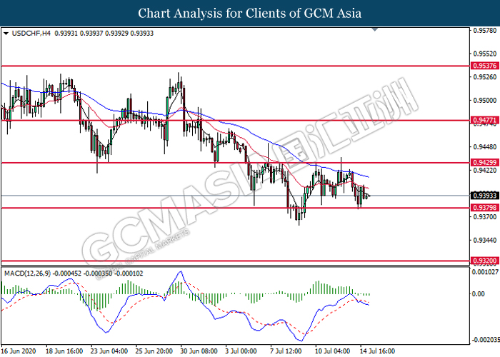 USDCHF, H4: USDCHF was traded higher following prior rebound from the support level at 0.9380. However, MACD which illustrate bearish bias momentum suggest the pair to undergo technical correction in short term.
