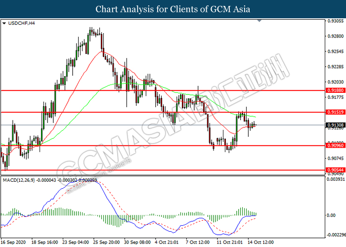 USDCHF, H4: USDCHF was traded lower following prior retracement from the resistance level at 0.9150. MACD which illustrated diminishing bullish momentum suggest the pair to extend its losses toward support level at 0.9095.