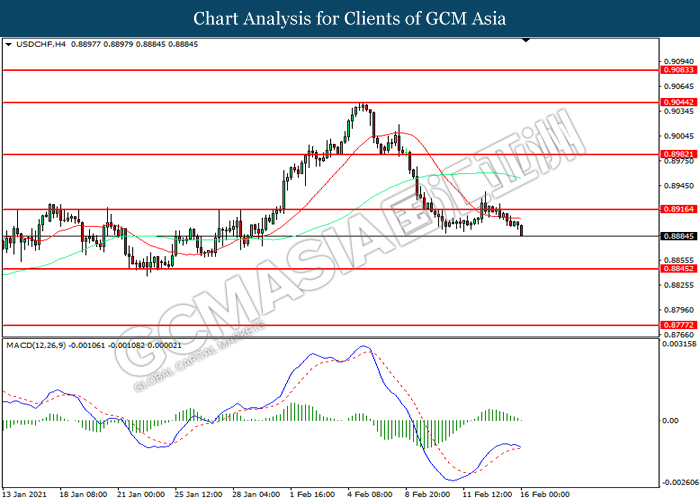 USDCHF, H4: USDCHF was traded lower following prior breakout below the previous support level at 0.8915. MACD which illustrated diminishing bullish momentum suggest the pair to extend its losses toward support level at 0.8845.