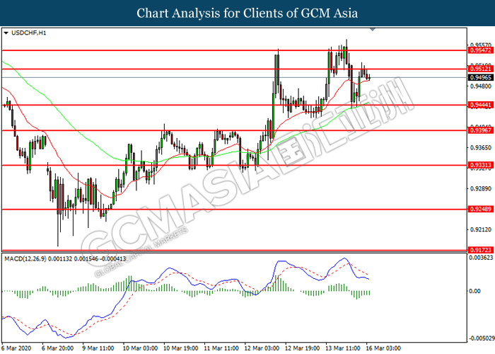 USDCHF, H1: USDCHF was traded lower following prior retracement from the resistance level at 0.9510. MACD which illustrated increasing bearish momentum suggest the pair to extend its losses toward support level at 0.9445.