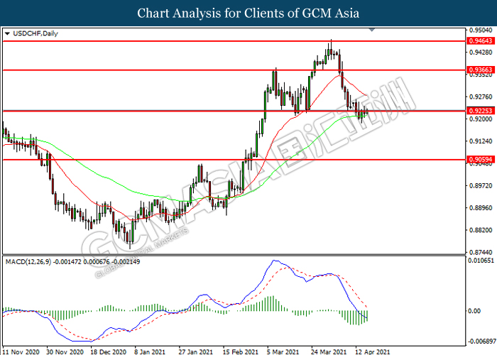 USDCHF, Daily: USDCHF was traded lower while currently testing the support level at 0.9225. However, MACD which illustrated diminishing bearish momentum suggest the pair to be traded higher in short-term as technical correction.