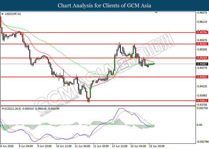 USDCHF, H1: USDCHF was traded lower following prior breakout below the previous support level at 0.9505. However, MACD which illustrated diminishing bearish momentum suggest the pair to be traded higher in short-term as technical correction.