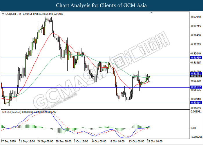 USDCHF, H4: USDCHF was traded higher while currently testing the resistance level 0.9155. MACD which illustrate ongoing bullish momentum signal suggest the pair to extend its gains after it breaks above the resistance level.