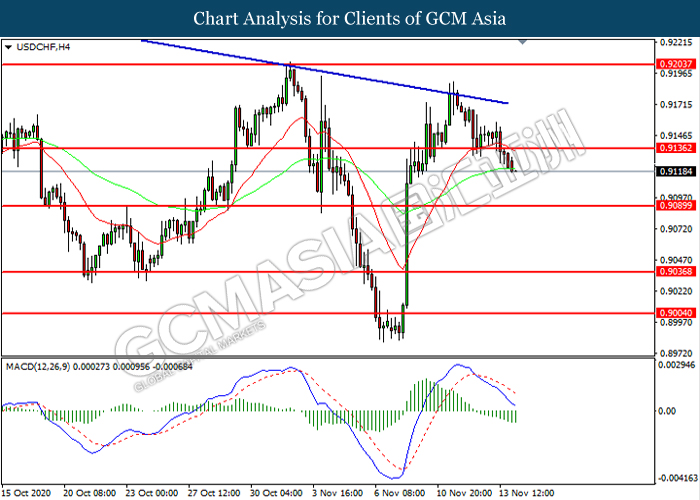 USDCHF, H4: USDCHF was traded lower following prior breakout below the previous support level at 0.9135. MACD which illustrated increasing bearish momentum suggest the pair to extend its losses toward support level at 0.9090.