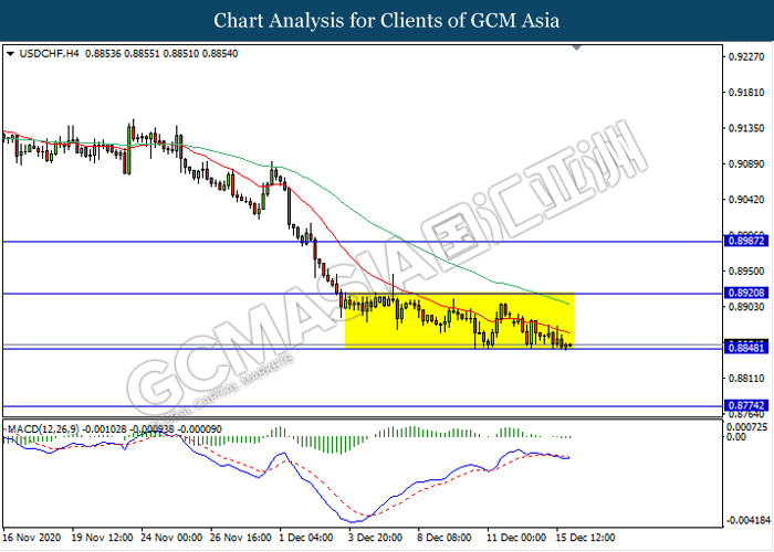USDCHF, H4: USDCHF remain traded in a sideway channel while currently testing the support level 0.8850. However, MACD which illustrate bearish bias signal suggest the pair to be traded lower after it breaks below the support level.