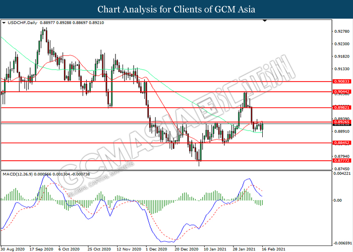 USDCHF, Daily: USDCHF was traded within a range while currently testing the resistance level at 0.8925. MACD which illustrated diminishing bearish momentum suggest the pair to extend its gains after it successfully breakout above the resistance level.