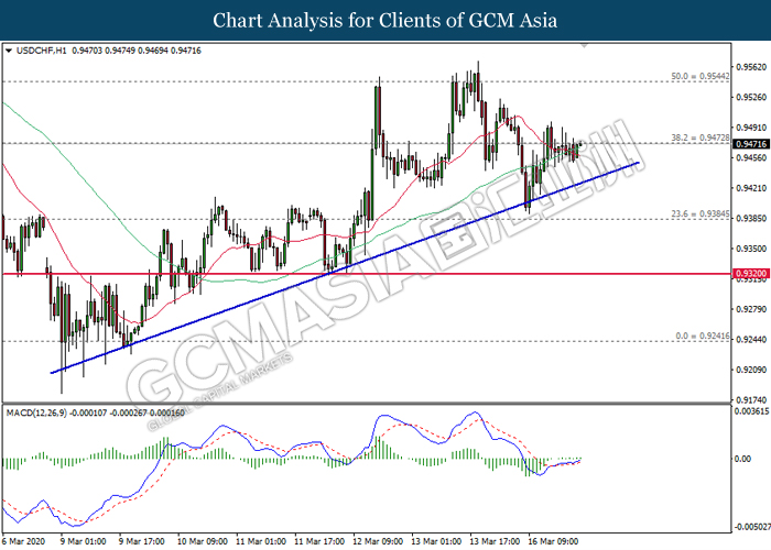 USDCHF, H1: USDCHF was traded higher following prior rebound from the lower level. MACD which illustrate bullish signal suggests the pair to extend its gains after closing above 0.9470.