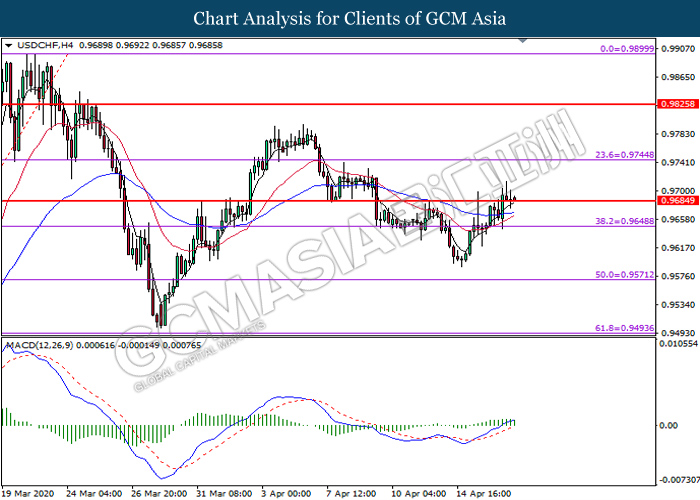 USDCHF, H4: USDCHF was traded higher following prior breakout above the previous resistance level at 0.9685. MACD which illustrate bullish bias momentum signal suggest the pair to extend its gains toward the resistance level at 0.9745.