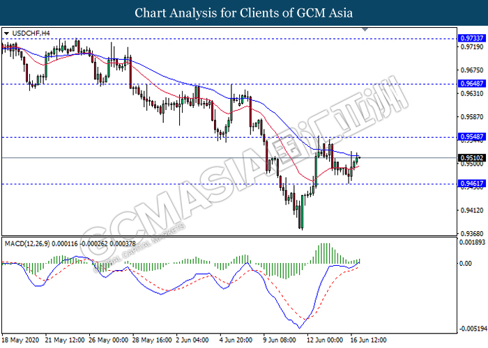USDCHF, H4: USDCHF was traded higher following prior rebound from the support level 0.9460. MACD which illustrate persistent bullish momentum signal suggest the pair to extend its rebound towards the resistance level 0.9550.