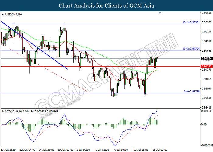 USDCHF, H4: USDCHF was traded higher following prior rebound from the support level at 0.9435. However, MACD which illustrated diminishing bullish momentum suggest the pair to be traded lower in short-term as technical correction.
