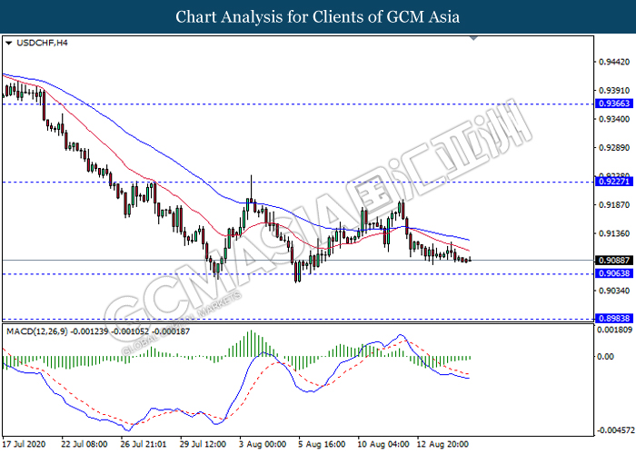 USDCHF, H4: USDCHF was traded lower while currently testing near the support level 0.9065. However, MACD which illustrate diminishing bearish bias signal suggest the pair to be traded higher as a technical correction towards the resistance level 0.9225.