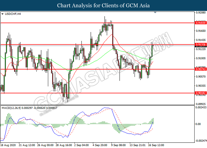 USDCHF, H4: USDCHF was traded higher while currently testing the resistance level at 0.9135. MACD which illustrated increasing bullish momentum suggest the pair to extend its gains after it successfully breakout above the resistance level.