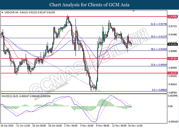 USDCHF, H4: USDCHF was traded lower following prior retracement from the resistance level at 0.9135. However, MACD which display diminishing bearish momentum signal suggest the pair to undergo technical correction in short term toward higher level.