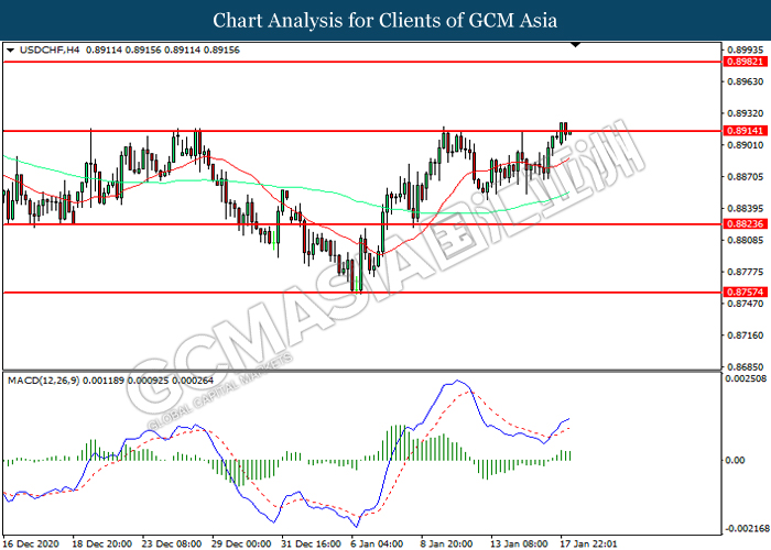 USDCHF, H4: USDCHF was traded higher while currently testing the resistance level at 0.8915. MACD which illustrated increasing bullish momentum suggest the pair to extend its gains after it successfully breakout above the resistance level.