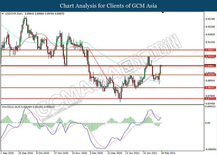 USDCHF, Daily: USDCHF was traded higher while currently testing the resistance level at 0.8980. MACD which illustrated diminishing bearish momentum suggest the pair to extend its gains after it successfully breakout above the resistance level.