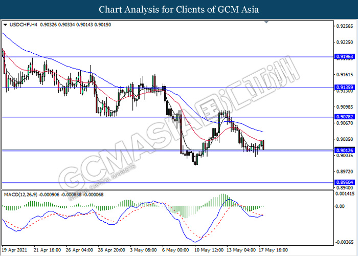 USDCHF, H4: USDCHF was traded lower while currently testing the support level 0.9010. MACD which illustrate diminishing bearish momentum signal with the starting formation of death cross suggest the pair to experience a technical correction towards the resistance level 0.9080.