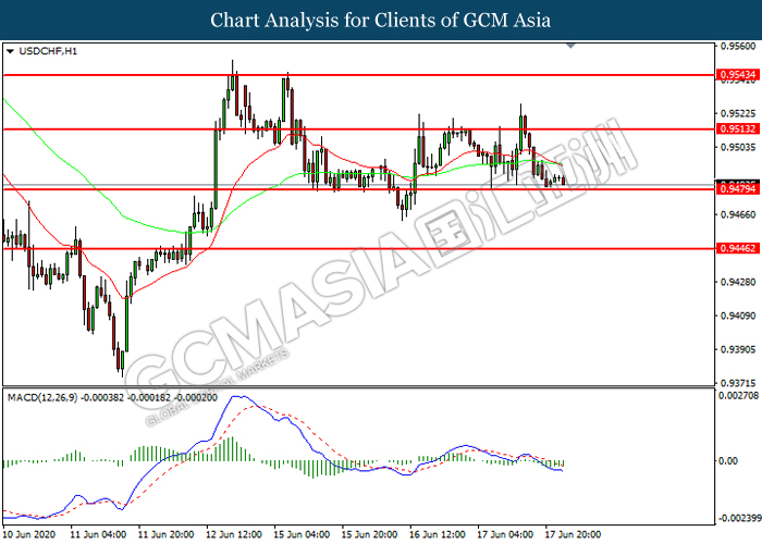 USDCHF, H1: USDCHF was traded lower while currently testing the support level at 0.9480. MACD which illustrated increasing bearish momentum suggest the pair to extend its losses after it successfully breakout below the support level.