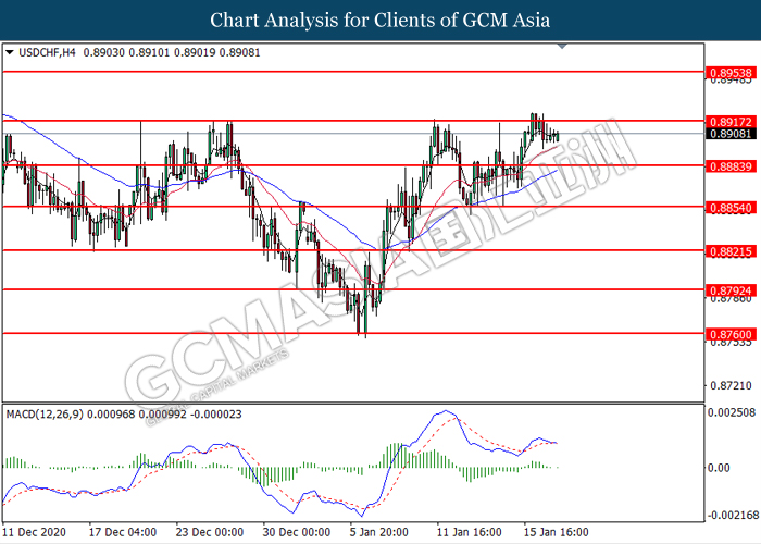 USDCHF, H4: USDCHF was traded lower following prior retracement from the resistance level at 0.8915. MACD which illustrated diminishing bullish momentum suggest the pair to extend its losses toward the support level at 0.8885.