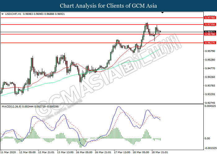 USDCHF, H1: USDCHF was traded lower following prior retracement from the resistance level 0.9735. MACD which illustrated increasing bearish momentum suggest the pair to extend its losses toward support level at 0.9680.