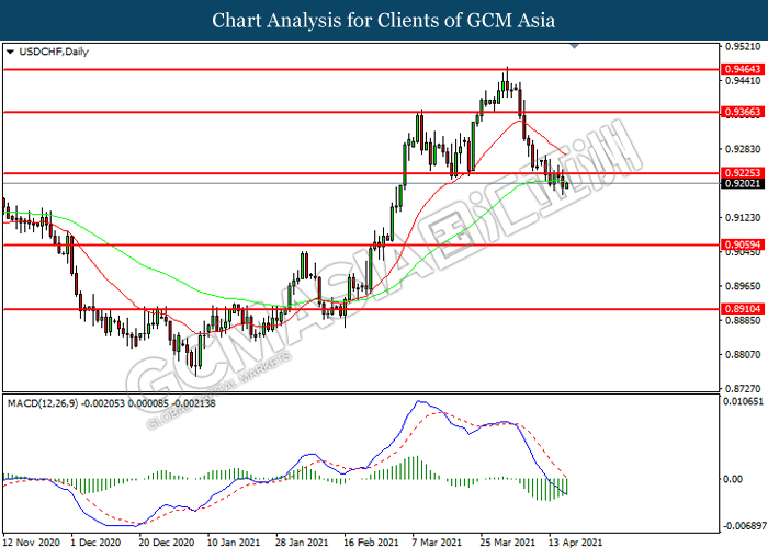 USDCHF, Daily: USDCHF was traded lower following prior breakout below the previous support level at 0.9225. However, MACD which illustrated diminishing bearish momentum suggest the pair to be traded higher in short-term as technical correction.