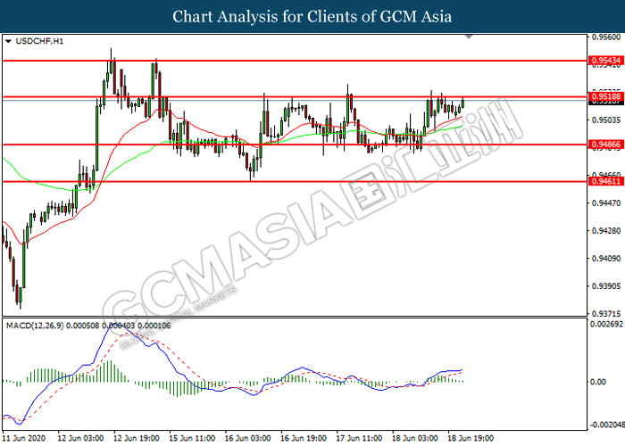USDCHF, H1: USDCHF was traded higher while currently testing the resistance level at 0.9520. However, MACD which illustrated diminishing bullish momentum suggest the pair to be traded lower in short-term as technical correction.